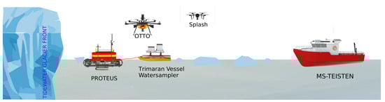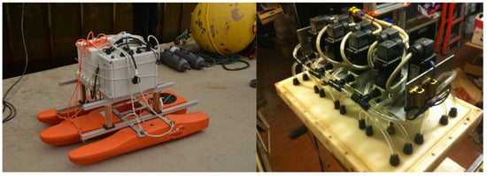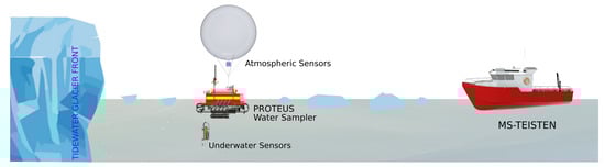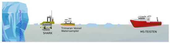 The project, Arctic: Present Climatic change and past extreme events—ARCA, aimed at developing a conceptual model on the mechanism(s) behind the release of large volumes of cold and fresh water from the melting of ice caps and supported the development and testing of new technologies targeted to improve process investigation at the interfaces of the different system components, in particular hydrosphere-atmosphere and hydrosphere-cryosphere. As described above, since it is characterised by Atlantic water influx and the melting of tidal glaciers, Kongsfjorden was considered a pilot site for the evaluation of new technologies for the study of the interface between the melting glaciers front and the sea inside the Arctic fjords. Within this framework, the ARCA project supported the development of a first prototype system to perform the discrete sampling of waters in the proximity of tidewater glacier fronts. The purpose was to obtain in situ data to study the heterotrophic bacterial distribution and functional metabolism near the glacier to better understand the hydrology cycle and its consequences on the climate in the Boreal hemisphere. To this aim the prototype Shark USSV was equipped with a towed trimaran mounting an AWS (see Section 3.1). The resulting operational configuration is shown in Figure 12.