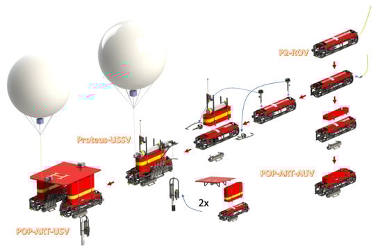PROTEUS (Portable RObotic TEchnology for Unmanned Surveys) hybrid ROV/USSV is a fully electric vehicle that physically implements the concept of portable modular reconfigurable Unmanned Marine Vehicles, elaborated by CNR marine robotics researchers on the basis of their experience in polar applications. In particular, the project RAISE, funded by the Italian National Programme of Research in Antarctica (PNRA), where the distribution of Pleurogramma Antarctica’s eggs and larvae [30] in the platelet ice was monitored with the support of a VideoRay mini-ROV adapted by the CNR robotics team, pointed out the need of highly modular and portable light robotic vehicles, easily transportable by helicopters and manageable by a couple of people with no cranes or similar tools. As a consequence, in the framework of the PNRA POLE project, the Portable Polar ROV (P2-ROV) was developed [31], satisfying not only requirements in terms of modularity and portability, but also an operational size and shape constraints. This led to the design of an open-frame torpedo-like vehicle suitable for the deployment through a hole in the packed ice made by a manual core drill. P2-ROV is the basis of the POP-ART concept represented in Figure 9: An open-frame torpedo-shaped ROV which is transformable into different kinds of UMVs (ROV, USSV, and AUV) by adding or removing various modules. In this framework, the prototype hybrid ROV/USSV PROTEUS was designed and built as a portable (45–70 kg weight, 1.5 m long, 0.35–0.5 m wide, and 0.35–1.5 m high), highly modular, and reconfigurable vehicle. It is constituted by a core body and various portable modules that can be assembled at field to compose a task-changing modular vehicle. PROTEUS core can be operated as a ROV when tethered to a mother-ship. It can also be transformed into an USSV by removing the tether cable, adding a battery pack below the vehicle, installing on its top a module composed of foam, GPS and radio communication system, and moving vertical thrusters to a horizontal surge configuration. One of the most important features of PROTEUS is the highly flexible and impact resistant frame, which is especially designed, seeking modularity, for quick installation and shifting of tools, equipment, and sensors. PROTEUS thrusters are also interchangeable, displaceable modules expressly designed by CNR personnel. In this way the vehicle can be turned into a different kind of UMV (ROV, USSV) and by connecting two USSV units with a mechanical frame, a catamaran can be obtained. Moreover, PROTEUS can be reconfigured upon each expedition according to specific needs. Thanks to its open hardware and software architectures, PROTEUS can easily be fitted on board with a number of different sensors and actuators according to the specific mission. The presence of modular elements of buoyant foam on top of the frame makes it possible to quickly balance the trim to compensate variations in the weight.