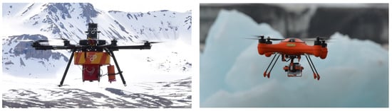 Besides USSVs, two full electric UAVs, OTTO and Splash, were also used during the surveys for different purposes. OTTO, see Figure 11, is an octocopter drone originally developed by Italdron and later adapted for polar campaigns by CNR, characterised by a high payload capacity and able to perform high quality professional flight missions in a high flight safety conditions to achieve specialised operations in critical areas. The drone was ENAC certified (S.A.P.R.) with flight termination system, rescue parachute, and an additional emergency floating buoy. Moreover it was guided with a redundant pilot system (dual pilot) with manual, automatic, and mission planning functions. In a polar mission configuration, it was equipped with various video cameras, a FLIR A35 thermal camera and an aerial multi-sensor (humidity, temperature, and air quality sensors) system, named AirQino, provided by IBIMET-CNR [32,33]. The Splash drone, see Figure 11, is a commercial waterproof quad-rotor, used to record videos and images of the coordinated operations performed by PROTEUS USSV and OTTO UAV for documentary and dissemination purposes.