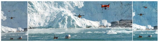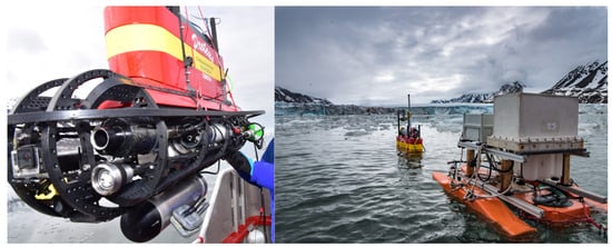 In the same years, from 2015 to 2018, field experimental activity carried out by Italian National Research Council (CNR) researchers in the Arctic regions supported the evaluation and demonstration of capabilities and effectiveness of Unmanned Marine Vehicles (UMVs), aerial, surface, and underwater, in monitoring and sampling the sea-ice-atmosphere interface in front of tidewater glaciers. In particular, in 2015, 2017, and 2018 (depicted in Figure 1) respectively, three campaigns were carried out in Ny-Ålesund, Svalbard Islands, to demonstrate: (i) The capability of an Unmanned Semi-Submersible Vehicle (USSV) to approach a glacier front, collecting water samples just below it; (ii) the capability of a USSV to work in cooperation with UAVs for sea surface and air column characterisation in the proximity of fronts of glaciers; and (iii) the capability of a USSV, equipped with suitable tools and instruments, to perform a repetitive sampling of the water surface as well as studying the parameters of the water and air column close to the front of glaciers.