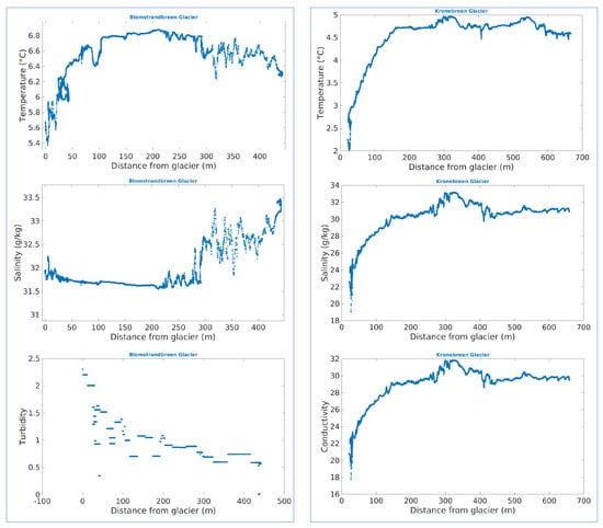 As discussed in [21], although the melt-water discharge from tidewater glaciers in the Kongsfjorden impacts the adjacent marine environment, the lack of data from close proximity to glacier fronts makes the mechanisms, through which melt-water runoff and subglacial discharge from tidewater glaciers influence marine primary production, to be still poorly understood.