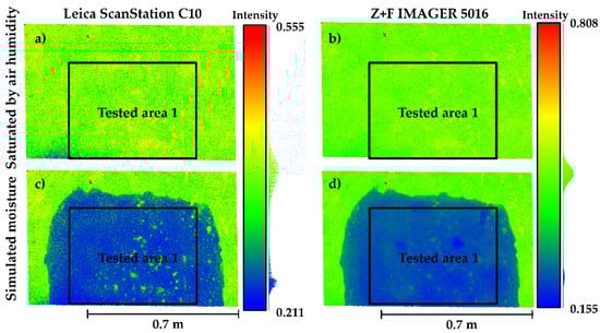 Value of intensity, recorded by terrestrial laser scanners (TLSs), for the external wall in different states of saturation (a) Saturated by air humidity sample measured via Leica ScanStation C10 scanner, (b) Saturated by air humidity sample measured via Z+F IMAGER 5016 scanner, (c) Simulated moisture sample measured via Leica ScanStation C10 scanner, (d) Simulated moisture sample measured via Z+F IMAGER 5016 scanner.