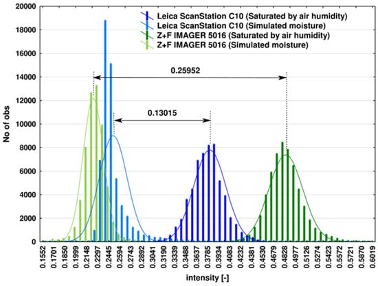 The results of area 1 are characterized by two separate peaks, which represent different saturation states for the two scanners. The difference between the average intensity for the area saturated by air humidity and the area intentionally saturated by tap water is equal to 0.13015 and 0.25952 for the Leica ScanStation C10 and Z+F IMAGER 5016 scanners, respectively. In this case, the sensitivity of the Z+F IMAGER 5016 is almost double that of the Leica ScanStation C10. A greater range of intensity values for the tested area facilitates the detection of surface changes by the TLS.
