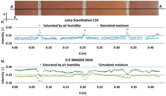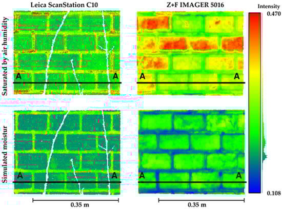 The profile presented in Figure 5 is an example of the variations in the intensity values, depending on the two states of saturation of the red brick wall. One can see that the difference between the intensity value for saturation by air humidity and intentional saturation by tap water of the Z+F IMAGER 5016 scanner is significantly greater than that of the Leica ScanStation C10 scanner. The different intensity values obtained by the TOF and PS scanners may be affected by the wavelength of the laser beam, the power of the TLS emitter and the sensitivity of the TLS detector. Thus, similar to the previous example, changing the moisture of the building wall had a greater effect on the radiometric information of the point cloud obtained by the Z+F IMAGER 5016 than the Leica ScanStation C10. The radiometric value of the laser beam was much higher on mortar joints than on the red brick for the point clouds obtained with the Leica ScanStation C10; it is the opposite for the Z+F IMAGER 5016.