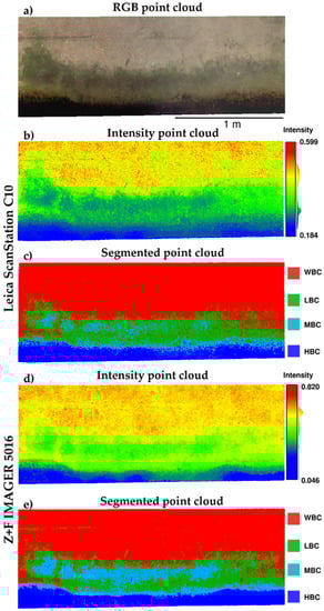 Intensity value, recorded by TLSs, for the external brick wall with biofilm, area 4, (a) RGB point cloud, (b) point cloud captured by Leica ScanStation scanner, (c) segmented point cloud captured by Leica ScanStation scanner, (d) point cloud captured by Z+F Imager 5016 scanner, (e) segmented point cloud captured by Z+F Imager 5016 scanner