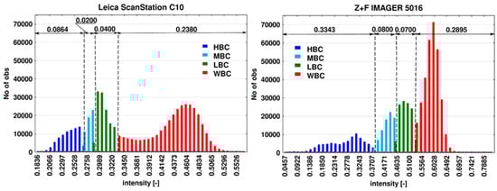 Comparing the segmentation results by intensity value for both TLSs, one can see that the area with HBC has the lowest intensity value. The WBC area is characterized by the highest intensity value. Thus, the results prove that the increased surface degradation caused by microorganisms simultaneously causes greater absorption of the laser beam. It should be noted that the sensitivity to changes in the wall surface is different for the Leica ScanStation and Z+F Imager 5016 scanners; for instance, the range intensity value for the HBC area is 0.0864 and 0.3343 for the two scanners, respectively (a four-fold difference). A similar situation occurs for the MBC area. A slightly smaller difference between the two scanners (0.0400 and 0.0700) can be seen for the LBC area. The range of intensity values for the WBC area does not differ significantly (0.2380 and 0.2895). In this case, the Z+F Imager 5016 is more likely to detect different degrees of biological corrosion in the building wall than the Leica ScanStation.