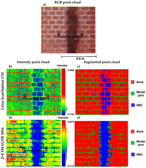 By comparing the results of the point cloud segmentation between the two scanners (Figure 8c,e), one can see that the Z+F IMAER 5016 scanner more clearly highlighted the HBC in comparison to the Leica ScanStation C10 scanner. On the other hand, the mortar joint area was much better highlighted, based on the dataset captured, by the Leica ScanStation C10 than the Z+F IMAER 5016. Red brick and mortar joints have different physicochemical properties, especially regarding roughness and color. These factors strongly affected the registered intensity value by the scanners. The TLS laser spot size may also affect the intensity registration of a distinct border between two surfaces, especially narrow stripes such as mortar joints. For better insight into the datasets, an additional profile was prepared (Figure 10).