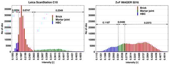 By analyzing the histogram, one can see that the HBC area is characterized by the lowest intensity value for both scanners. The recorded range of intensity values for the HBC area is 0.0254 and 0.1187 for the Leica ScanStation and Z+F Imager 5016, respectively (a four-fold difference). The achieved results are similar to the previous example. The Z+F Imager 5016 is more sensitive in the detection of biological corrosion in a building wall than the Leica ScanStation. The values of the recorded intensity for the red brick and mortar joint have the reverse order for the two scanners. Thus, the sensitivity of the laser beam to changes in the scanned surface is slightly different for both scanners.