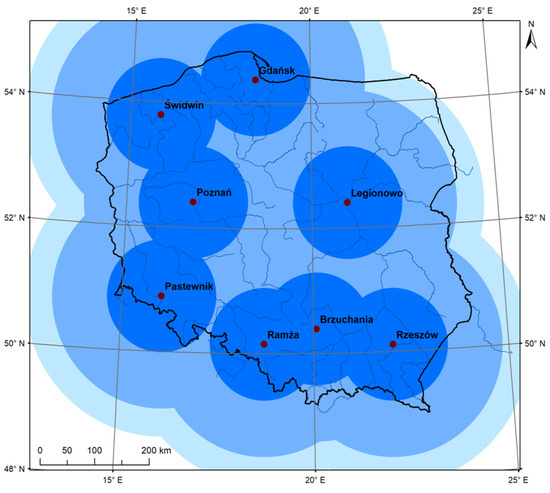 Coverage by weather radar network POLRAD with 100-, 200-, and 250-km range.