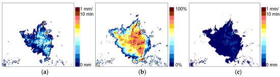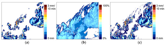 Example of precipitation accumulation estimated from Convective Rainfall Rate from Cloud Physical Properties (CRR-PH) and Precipitating Clouds from Cloud Physical Properties (PC-PH) products employing the daytime algorithm (17 May 2014, 08:00 UTC): (a) CRR-PH transformed into 10-min accumulation (in mm), (b) PC-PH (precipitation probability in %), and (c) 10-min precipitation accumulation Sday (in mm).