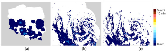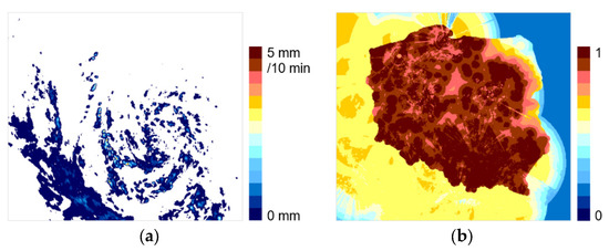 The last two products require both VIS and IR channels, so their generation is limited to daytime when the sun’s elevation is above 20°. The PC-PH product (Precipitating Clouds from Cloud Physical Properties) delivers information regarding the probability of the occurrence of precipitation with an intensity higher than 0.2 mm h−1. The algorithm is based on microphysical properties of clouds: droplets effective radius in the upper layer and the optical thickness of the cloud. The CRR-PH product (Convective Rainfall Rate from Cloud Physical Properties) delivers information regarding precipitation rate (in mm h−1) from convective clouds as well as stratiform clouds that are associated with convective systems. The product is similar to CRR, but additionally ingests information on microphysical cloud properties: water phase for cloud tops, effective radius of droplets, and optical thickness of cloud for rainfall determination [54,55,56].