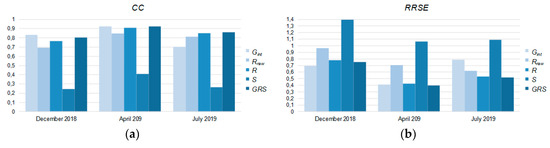 Monthly values of quality metrics: (a) correlation coefficient (CC), (b) root relative square error (RRSE), for particular precipitation fields: interpolated rain gauges (Gint), raw radar (Rraw), unbiased radar (R), satellite (S), and merged (GRS). The values are obtained for three months from different seasons: winter (December 2018), mixed (April 2019), and summer (July 2019).