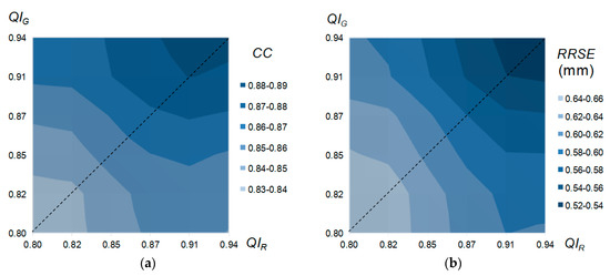 In Figure 10 two diagrams show the dependence of the final field reliability—expressed by the quality metrics CC and RRSE—on qualities of the two main input fields: rain gauge (QIG) and radar (QIR). The relatively high correctness of the algorithms for determining these qualities is confirmed by the increasing reliability of the resulting GRS field, with both qualities and the symmetry of the chart about the QIG = QIR line.