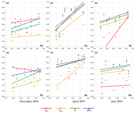 Diagrams of monthly values of correlation coefficient (CC) for particular precipitation fields: interpolated rain gauges (Gint), raw radar (Rraw), unbiased radar (R), and merged (GRS) depending on gauge data quality (QIG) at the top and radar data quality (QIR) at the bottom. The diagrams are obtained for winter (December 2018), mixed (April 2019), and summer (July 2019).