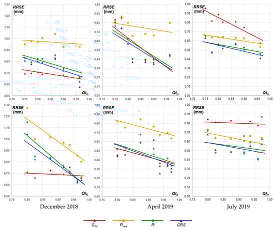 Diagrams of monthly values of root relative square error (RRSE) for particular precipitation fields: interpolated rain gauges (Gint), raw radar (Rraw), unbiased radar (R), and merged (GRS), depending on gauge data quality (QIG) at the top and radar data quality (QIR) at the bottom. The diagrams are obtained for winter (December 2018), mixed (April 2019), and summer (July 2019).
