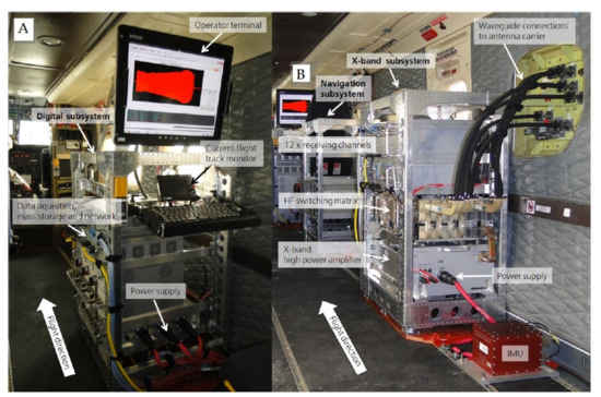 (A) DBFSAR mounted in the cabin of DLR’s Do228 aircraft: digital backend in the back, (B) HF front-end in the front and X-band wave-guide connections on the very right of the image.