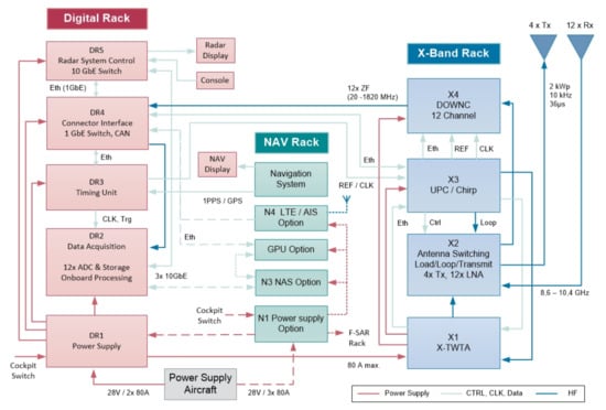 The basic concept of the DBFSAR radar system follows the flight and campaign proven setup of the former F-SAR system layout [14,15]. The hardware is divided into different units, depending on the task to fulfill. There are two main racks, which build the core setup called the digital and navigation unit. These core units are designed in a way that a modular combination of different radar racks for specified frequency bands is possible. The first realized radar unit is operating in the X-band at a center frequency of 9.5 GHz with a total system bandwidth of 1.8 GHz.
