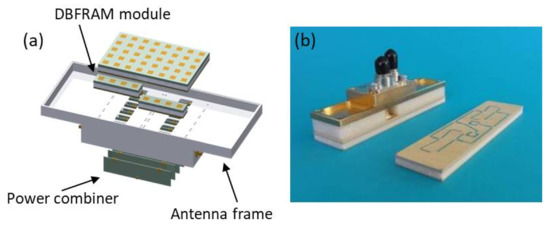 The DBFSAR antenna system consists of 4 individual single polarized transmit horn antennas, which are designed for high average power, and 12 DBF receive antennas, based on microstrip technology. Important general design parameters are 2 GHz system bandwidth at 9.5 GHz center frequency. The transmit antennas have equal pattern characteristics in the two principal planes, thus the antennas can be used either to transmit horizontally or vertically polarized signals, dependent on the orientation of the antenna in the antenna frame. With a set of two antennas a full polarimetric measurement is possible. The antenna frame supports four transmit antennas, one pair with 30 half power beamwidth and an alternative pair with narrow beamwidth of 16. On the receive side, DBF modules consisting of 1 × 4 stacked patch elements are used, denoted as DBFRAM (DBF Receive Antenna Modules). A photo of such a DBFRAM module is shown in Figure 3b. The subarrays possess a high efficiency (>75%) and constant amplitude and phase distribution for minimizing noise figures. A maximum of 12 of these DBFRAM modules are combined to form the actual DBF receive array needed, allowing for pointing angles up to ±15 deg, in respect to the maximum illuminated footprint of the transmit antennas. A reconfigurable antenna backplane allows various combinations of DBFRAM modules, in along-track directions, across-track directions, or a mixture of both (Figure 3a). If needed, two of the DBFRAM modules can be combined in a second level to form alternative 1 × 8 or 2 × 4 subarrays, to be then combined into the full DBF array. The antenna backplane is designed to house the DBFRAM module in both vertical and in horizontal orientation.