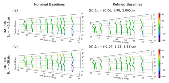 A comparison of residual interferometric phase errors before and after 3D baseline calibration for two different channel combinations. Each colored line represents the range history of a single trihedral reflector in the polar antenna coordinate system. Colors indicate the phase errors measured along the phase history. The columns separate the phase error evaluation before (a,c) and after (b,d) baseline calibration. The horizontal baseline is annotated on the left side of each row, while the right column includes the 3D baseline correction estimated in the calibration process.The first row (a,b) represents a pair of channels with receive antennas 2 and 4, while the second row (c,d) corresponds to receive antennas 6 and 4.