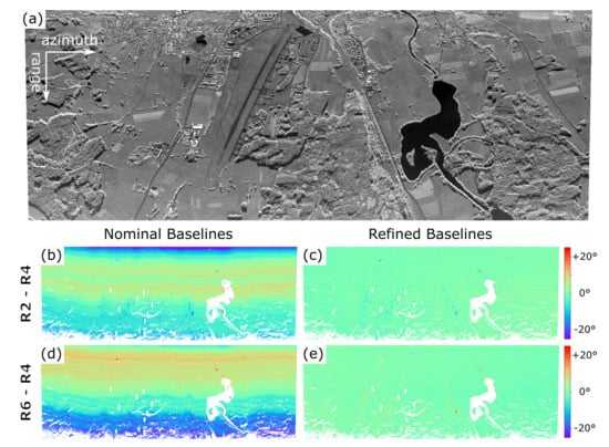 The impact of baseline calibration on the along-track interferometric phase measured in an acquisition of the V-SAR sensor over the calibration test site in Kaufbeuren, Germany: (a) the backscatter amplitude at X-ban; and (b–e) a matrix showing the along-track interferometric phase before and after baseline calibration (columns) for two of the five baselines (rows). The interferometric channel combinations shown as well as the 3D baseline corrections in (b–e) correspond to those of Figure 6a–d, respectively.