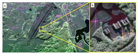 First fully calibrated DBFSAR image, showing the calibration test site of Kaufbeuren (a), including a zoom into the small feature marked in yellow to illustrate the high resolution imaging capabilities of DBFSAR. HH = blue, VV = red, and HV = green (b).