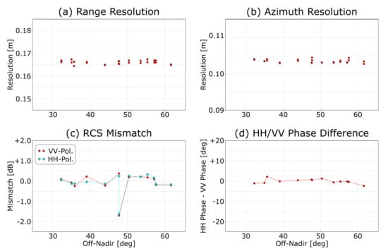 Results of analyzing the response of trihedral reflectors deployed at regular intervals across the imaged swath in focused SAR imagery of the 16DBFTST campaign. Clockwise from the top left: the range (a) and azimuth (b) resolution achieved; the difference between the expected and the measured target radar cross section (c); and HH/VV polarimetric phase imbalance (d).
