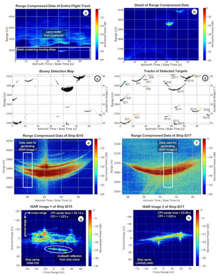 Preliminary ship detection, tracking and ISAR imaging result obtained from V-SAR airborne radar data. In the images, the following are shown: (a) range-compressed radar data acquired during a single linear flight track (the corresponding fully focused SAR image is shown in Figure 8 at the top); (b) crop of the data containing several ship signals but no land clutter; (c) binary detection map obtained after applying a CFAR detector; (d) ship tracking results obtained by a tracker based on the Kalman filter; (e,f) range-compressed data belonging to the tracked ships with IDs 15 and 17; and (g,h) corresponding ISAR images obtained by a generic ISAR processor—the used CPI of 1.023 s results in a cross-range resolution of approximately 0.6 m.