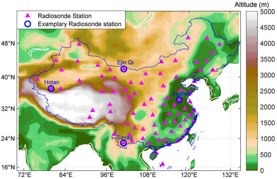 Radiosonde is an accurate method to measure meteorological parameters and usually used to validate other observations and model outputs [32,33,34,35,36]. The radiosonde data are accessed freely from the archive at the website of the University of Wyoming (http://weather.uwyo.edu/upperair/sounding.html). These data are available at 00:00 UTC and 12:00 UTC every day. We downloaded all the available radiosonde data in the research area in 2017 and derived the temperature, pressure, and water vapor pressure. After removing 9 stations whose data quality was bad, 80 radiosonde stations were finally used and their distribution is shown in Figure 1.