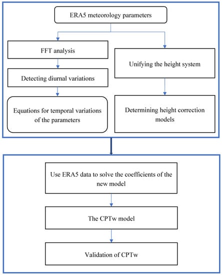 To model the pressure, temperature, and water vapor pressure, we have to know their temporal and spatial variation features. As for the temporal variation, we mainly detect and determine its periodical variations. As for spatial variation, we separately describe its vertical and horizontal variations. We used 0.25° grids to describe the horizontal variations and used empirical models to describe the vertical variations. Therefore, determining the temporal and vertical variations of these parameters were the two key aspects in modeling them. The detailed steps for establishing the new model follow: Firstly, we used fast Fourier transform (FFT) analysis to detect the diurnal variations of pressure, temperature, and water vapor pressure based on the ERA5 data. Secondly, we determined the empirical models to describe the vertical variations of the three parameters and then used them to make height corrections. Finally, we determined the mathematical frames of the model and embodied it by determining its coefficients using ERA5 data. The schematic methodology for generating the CPTw is shown in Figure 2.