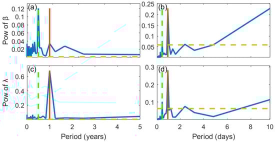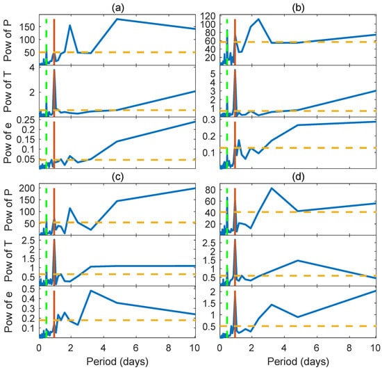 Two peaks are observed at 1 day and 0.5 day in the power spectrums of pressure (Figure 3a–d), suggesting that pressure has strong diurnal and semidiurnal variations. This is due to the atmospheric tides and was revealed by [37]. Especially, the peaks at 0.5 day are even greater, which displays that the semidiurnal variation is stronger than the diurnal variation. As for the temperature, two peaks are also observed at 1 day and 0.5 day (Figure 3a–d) but the 0.5-day peak is much weaker than the 1-day peak, which indicates that temperature has a forceful diurnal variation and a feeble semidiurnal variation. A peak from the power spectrum of water vapor pressure appears at 1 day in Figure 3b–d but does not appear in Figure 3a. Even when it has peaks at 1 day, the peaks are usually below the 95% level. The power spectrum of water vapor pressure does not show any peak at 0.5 day, indicating it has no regular semidiurnal variations. So, the diurnal variations of water vapor pressure are not as regular as the pressure and temperature, which present difficulties in modeling it.
