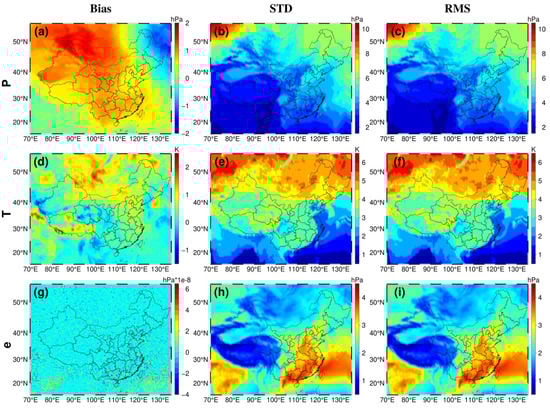 Bias, STD, and RMS of the pressure (a–c), temperature (d–f), and water vapor pressure (g–i) validated by ERA5 hourly surface 0.25° × 0.25° data in 2017.