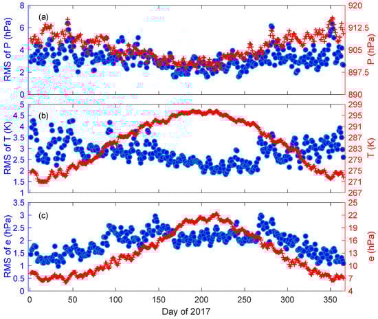 RMS of fitting residuals of pressure (a), temperature (b), and water vapor pressure (c).