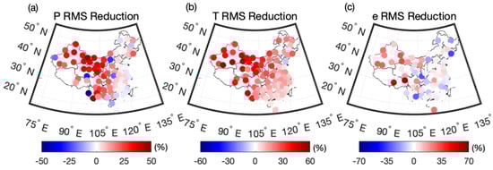 To demonstrate the performances of different models in a more intuitive way, Figure 7 gives RMSs reduction at all radiosonde sites. It can be seen in Figure 7a that the CPTw model shows smaller pressure RMS than the GPT2w model at most stations, notably in the western regions. Figure 7b shows that the CPTw model’s RMS for temperature is significantly decreased in comparison with the GPT2w model at almost all stations, and the reduction is greater in the western regions than that in other regions. Figure 7c reveals that the RMS of CPTw model for water vapor pressure is smaller than that of the GPT2w model at more than half of stations, and most of the RMS reductions appear in the western regions.