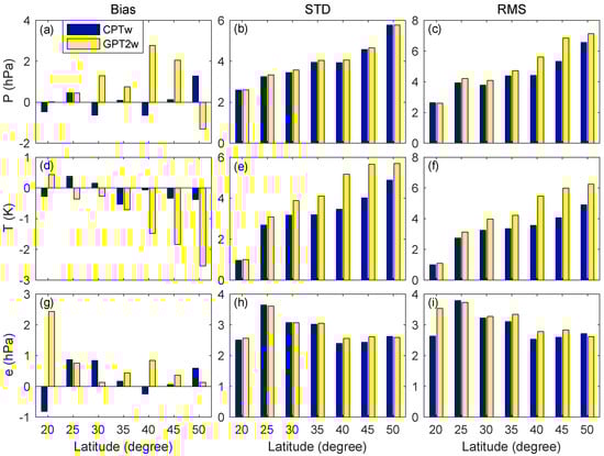 Bias, STD, and RMS of pressure (a–c), temperature (d–f), and water vapor pressure (g–i) from different models at different latitude ranges.