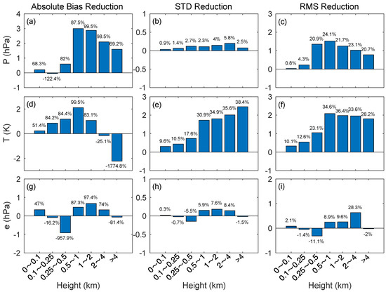 Absolute bias reduction, STD reduction, and RMS reduction of pressure (a–c), temperature (d–f), and water vapor pressure (g–i) from the CPTw model in comparison with the GPT2w model at each altitude range. (Positive values mean positive accuracy improvements in the CPTw model).