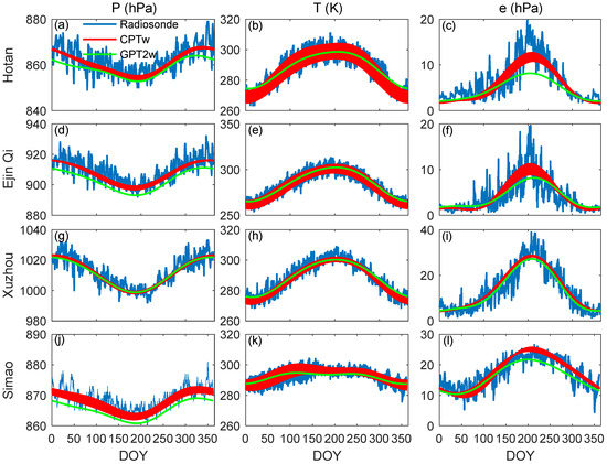 To investigate the models’ accuracies at different times, Figure 10 provides the pressure, temperature, and water vapor pressure from the CPTw model and the GPT2w model in 2017 compared with the radiosonde data at four stations Xuzhou, Hotan, Simao, and Ejin Qi. These four stations are located in the eastern, western, southern, and northern China (see Figure 1). It shows that a better consistency exists between the CPTw pressure and the radiosonde data at the four stations compared to the GPT2w model. The GPT2w model underestimates pressure for most of the time, resulting in overall a positive bias. There is a better agreement between temperature from the CPTw model and the radiosonde temperature compared to the GPT2w model. The water vapor pressure is apparently underestimated by the GPT2w model in summer, while the CPTw water vapor pressure is more consistent with the radiosonde data. In addition, the CPTw model’s curves for meteorological parameters are thicker than the corresponding curves of the GPT2w model. This result means that the CPTw model can capture high-frequency variations of meteorological parameters while the GPT2w model cannot. This is attributed to modeling of diurnal variations. Overall, the results in Figure 10 indicate that the CPTw model has more temporal stability than the GPT2w model for forecasting meteorological parameters.