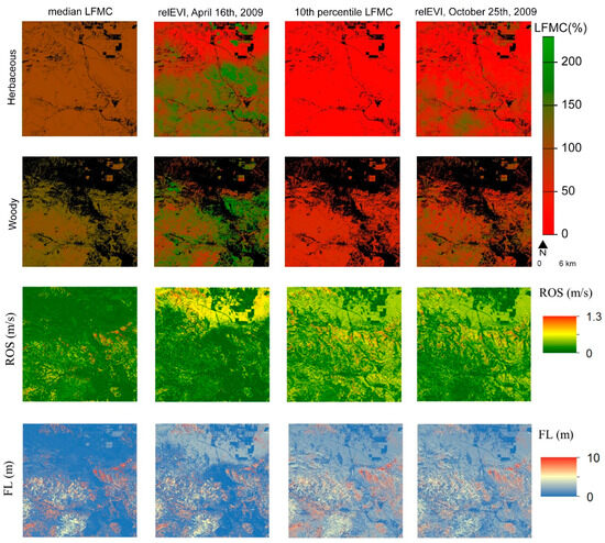 Herbaceous and woody LFMC products from a constant median and tenth percentile LFMC, and from Landsat-5 TM relEVI data on April 16th and on October 25th of 2009 and estimated fire behavior for each scenario in terms of ROS and FL.