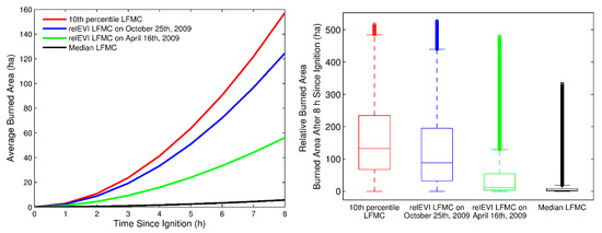 Simulations considered four LFMC scenarios: a constant overall median LFMC value of 99% for herbaceous, 129% for shrubs and 109% for forest from Jasper Ridge field data; a constant overall tenth percentile LFMC value of 30% for herbaceous, 55% for shrubs and 65% for forest also from Jasper Ridge field data; and the LFMC product generated with the relEVI from Landsat-5 TM data on 16 April 2009 and 25 October 2009. The median and tenth percentile were calculated considering the minimum and maximum values of all samples collected in Jasper Ridge for each vegetation type [15]. The Landsat-5 TM dates were selected since they would represent two distinct LFMC scenarios, in spring and end of the summer/beginning of autumn. Note also that according to Rothermel’s surface fire behavior model, herbaceous LFMC is cured at 30% and woody LFMC enters dormancy at 60% [42,46].