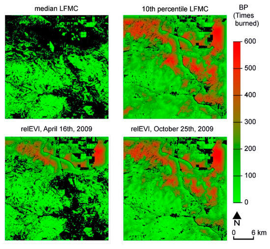 The LFMC products from Figure 2 caused differences in the fire simulations performed on WFA (Figure 2, Figure 3 and Figure 4). All input variables in the simulations were the same except the herbaceous and woody LFMC layers. Despite this, the differences in fire behavior (both ROS and FL; Figure 2), average burned area per fire (Figure 3) and BP (Figure 4) were significant and increased with the time since ignition. Results based on 16th of April and 25th of October LFMC fell in between the minimum value of the tenth percentile and the maximum of the median LFMC (Figure 3). We observed spatial differences in terms of ROS and FL among the LFMC products (Figure 1). For instance, the ROS for 16th of April was higher in the northern part of the study area than in the southern part, whereas this pattern was the inverse for other scenarios such as 25th of October, suggesting the importance of considering the spatial variability of LFMC in operational environments. These results are consistent with the BP outputs (Figure 4), given that the areas with higher BP values also had higher ROS. BP maps derived using the tenth percentile and relEVI for the 25th of October, showed similar spatial distribution (Figure 4), although higher BP values where obtained for the former which resulted in an average difference in burned area greater than 30 ha 8 h after ignition (21% and 36% higher than the burned area for the relEVI 25th of October and 16th of April, respectively). Differences in the spatial distribution in BP maps were more evident when comparing the relEVI maps for 16th of April to the constant median LFMC value.