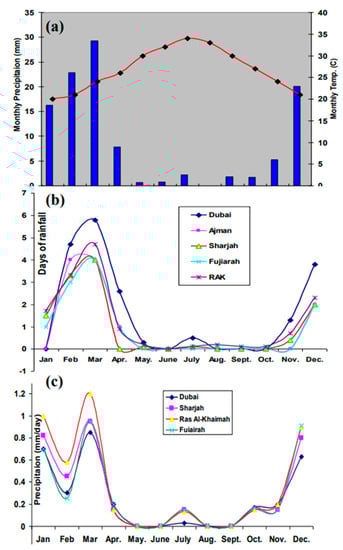 The area is characterised by hot and humid weather during the summer with average daily evaporation of 8.2 mm and is warm during the winter (Figure 2a). The monthly rainfall has reduced sharply and varies from 30 mm in the southeastern desert near the city of Dubai to 180 mm in the east and northeast mountainous areas [,].