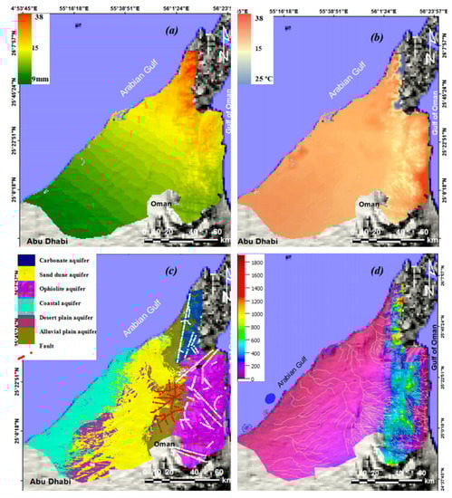 Maps of the spatial distribution of rainfall (a) and air temperature (b), and geohydrology (c), and wadi courses and palaeochannels generated from a DEM (d) of the study area.