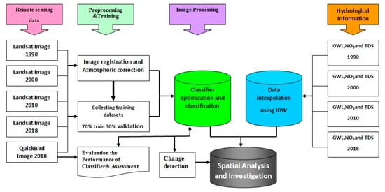 To investigate the impact of LULC changes on groundwater level and quality, seven steps were performed (Figure 4): (i) collecting training datasets (ii), selection of classifiers and optimal parameterisation, (iii) evaluation of classifiers performance, (iv) accuracy assessment of LULC maps, (v) monitoring LULC changes, (vi) monitoring spatiotemporal variations of groundwater level and quality, and (vii) spatial analysis and investigation.