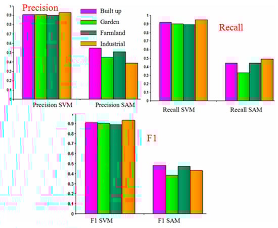 The results of the evaluation confusion metrics and a comparison of the precision, recall, and F1 scores is shown in Figure 5. The results showed the precision, recall, and F1 values for SVM classifier were high (0.89–95), and much more than those produced using SAM classifier for all LULC classes (0.33–0.71). All LULC classes produced using SVM showed similar values for precision, recall, and F1. Water body class showed the highest value for precision, recall, and F1 using the SAM classifier (0.71).