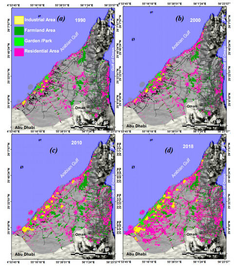 In terms of overall changes, the built-up area, especially in the emirates of Dubai and Sharjah, have grown rapidly in sabkha and sand dune areas towards the southwest and east directions (Figure 7). Spatial analysis of the LULC classes showed that all LULC subclasses (i.e., gardens/parks, farmlands, residential, and industrial) increased in time and space (Figure 6, Figure 7 and Figure 8 and Table 5).