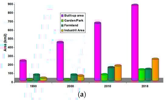 From 2000 to 2010, the residential area increased from 387.1 km2 (3.30%) to 494.72 km2 (4.21%) with a positive change of 107.62 km2 (0.91%), while the industrial area increased from 52.70 km2 (0.44%) to 168.92 km2 (1.44%) with a positive change of 116.22 km2 (0.99%). From 2010 to 2018, the residential and the industrial areas continue to increase in area by 129.11 km2 (1.10%) and 77.02 km2 (0.65%), respectively. The result also shows that the farmland area decreased from 149.71 km2 (1.27%) to 128.84 km2 (1.09%) with a negative change of −20.87 km2 (0.17%) (Figure 7b). The reason for the farmland decrease (during the period from 2010 to 2018) could be due to the decrease in groundwater level as a response to over-pumping, depletion of groundwater quality, and scarcity of rainfall (Figure 6 and Table 3).