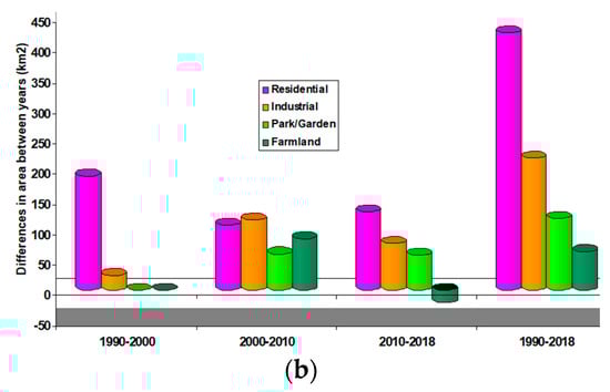 The accuracy assessment also shows that the 2010 and 2018 maps have an overall accuracy of 93.01% (kappa coefficient of 0.88) and 95.14% (kappa coefficient of 0.918). It is observed that the LULC maps of 2010 and 2018 are much better and more accurate maps than those in 1990 and 2000. These differences appear to be due to the lifetime and sensitivity of the sensor detectors and enhanced signal-to-noise and characteristics of the sensors [,,,].