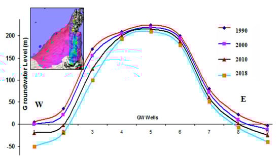 Further studies revealed that most of the landscape of the NUAE was extensively changed with development between 1990 and 2018 []. However, the impact of LULC changes on the groundwater level and quality in the NUAE has not yet been investigated. Multi-temporal Landsat images, monitoring LULC changes and spatiotemporal hydrological information, provide excellent information on the impact of LULC changes on groundwater level and quality depletion [].