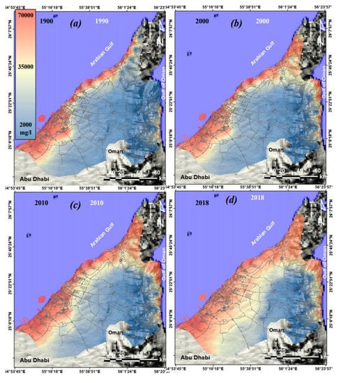 High TDS concentration is caused by seawater intrusion. Seawater intrusion is caused by overpumping, and overpumping may be caused by an increase in population/farmland increase to fulfill obvious needs. The UAE including the study area is characterised by a scarcity of rainfall and a high rate of evapotranspiration (2–3 m/year), which is very vulnerable to drought and earth subsidence [,]. Thus, there is a need for legislation to manage the use of water, and the rapid change in LULC should be controlled. A continued rapid change in LULC represents a serious threat to the hydrological resources of the UAE. The results of the proposed approach provide various information for land-use planners and water resources management. The use of LULC and hydrological maps could elicit a new spatial relationship between rapid LULC changes and land subsidence. Further investigation of the impact of groundwater level depletion (influenced by rapid LULC change) on seawater intrusion and land subsidence is suggested. This investigation permits a better understanding of the impact of the spatiotemporal variations in groundwater level and quality on the environmental and geotechnical setting. Future work should incorporate Sentinel-1 to monitor land subsidence (vertical movement) over the NUAE and support the correlation of results with the rapid changes in LULC and groundwater level.
