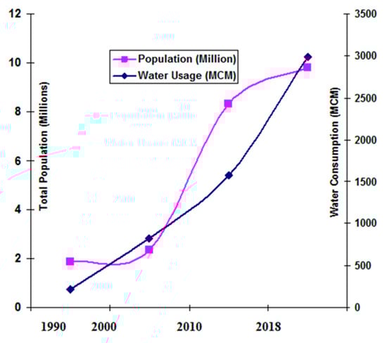 This means that the UAE is consuming groundwater reserves more than 20-fold compared to recharged water, and the UAE may run out of groundwater by 2030 []. This relationship was observed between annual population growth and groundwater and water usage (mcm) since 1990 (Figure 13).