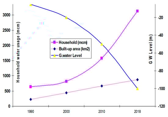 The link between population growth, urbanization, and groundwater level is clear when comparing the changes in residential areas and water usage of households (Figure 7 and Figure 14). The rapid changes in the built-up areas and population growth are highly correlated with water usage, including groundwater level (Figure 13 and Figure 14).